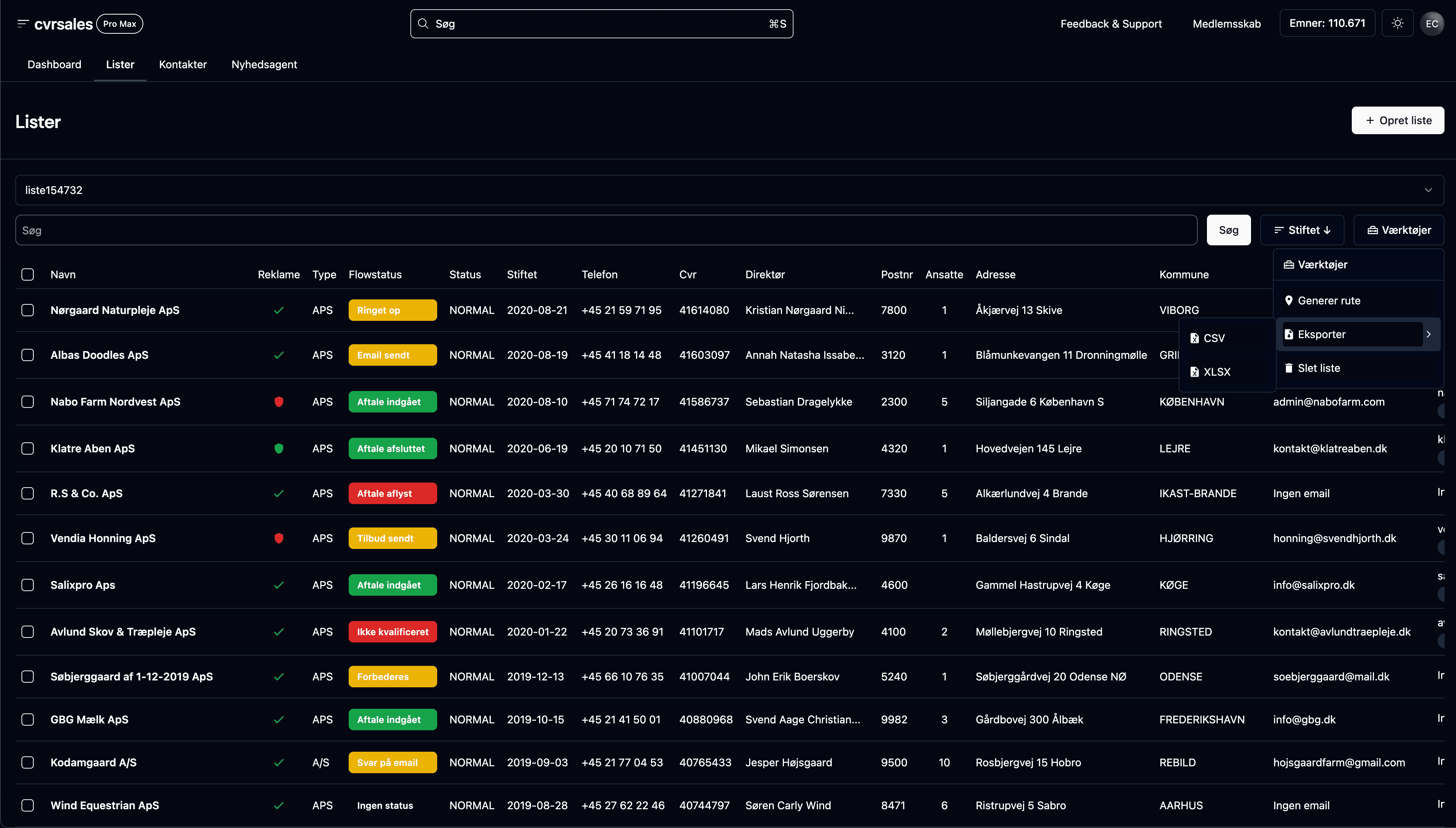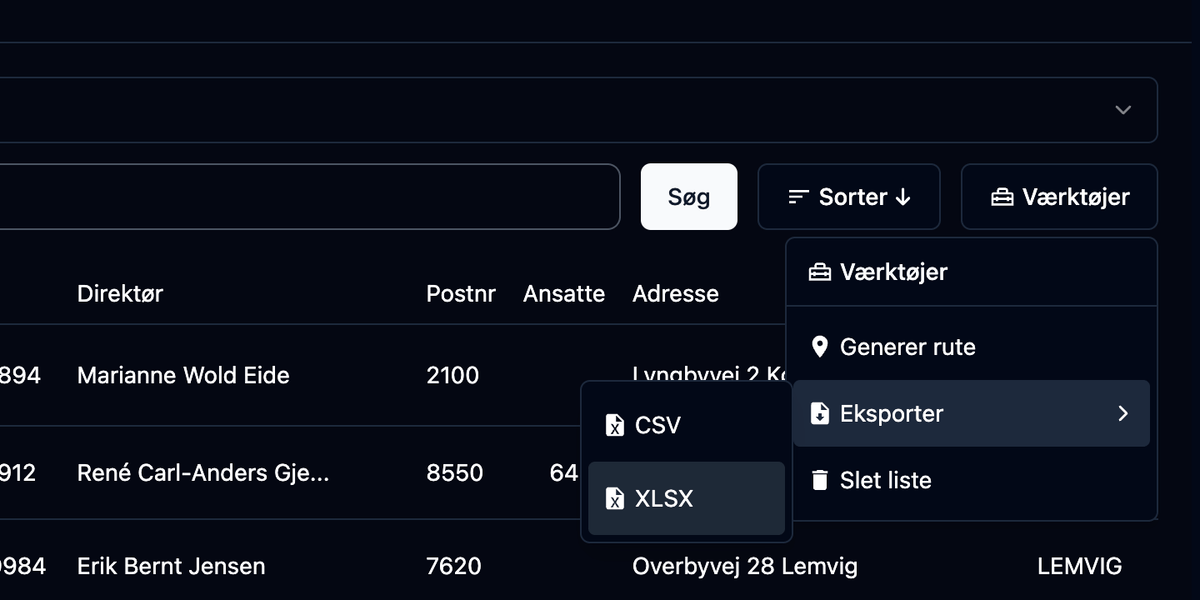 Eksporter data fra cvrsales til Excel, CSV eller CRM. Så kan du importere og bruge dataene i de systemer, du allerede bruger.